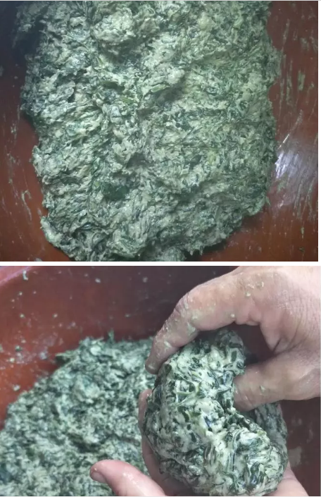 将掺匀的红芋叶子面作成窝窝馍形状,放入锅内,